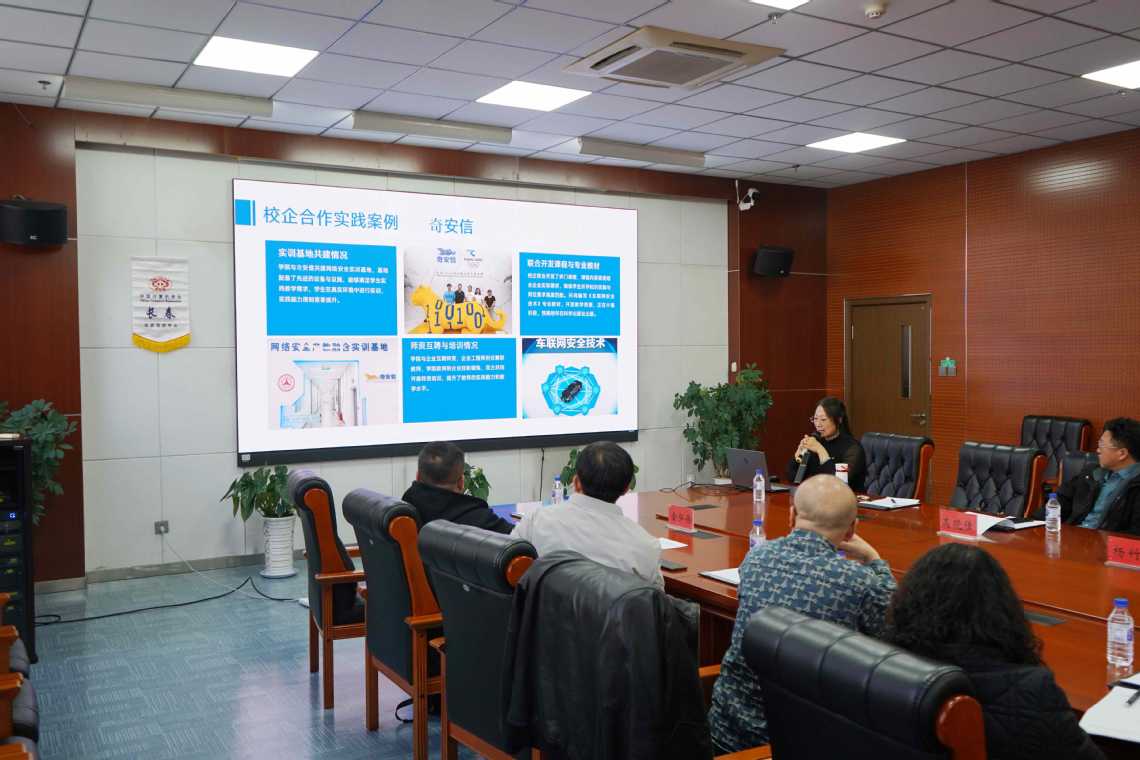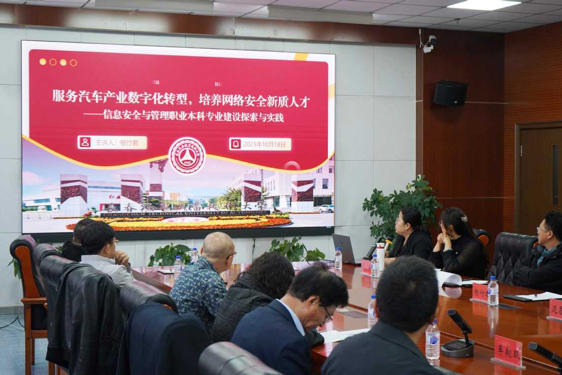 主题报告环节信息工程学院副院长杨竹君以“服务汽车产业数字化转型,培养网络安全新质人才 —— 信息安全与管理职业本科专业建设探索与实践”为题,结合长春区域汽车产业优势,详细阐述学校在信息安全与管理职业本科专业的课程设置、实践教学、师资建设等方面的规划与实践成果。信息工程学院科研产教负责人刘莹则围绕 “产教深度融合・职教创新发展”作主题报告,结合学校近年在车联网安全领域的校企合作案例,分析职业本科院校在科研与产业融合中的定位,提出通过真实企业项目驱动教学改革,提升学生工程实践能力,构建“产学研用”一体化育人机制,以满足地方智能网联汽车产业发展需求。