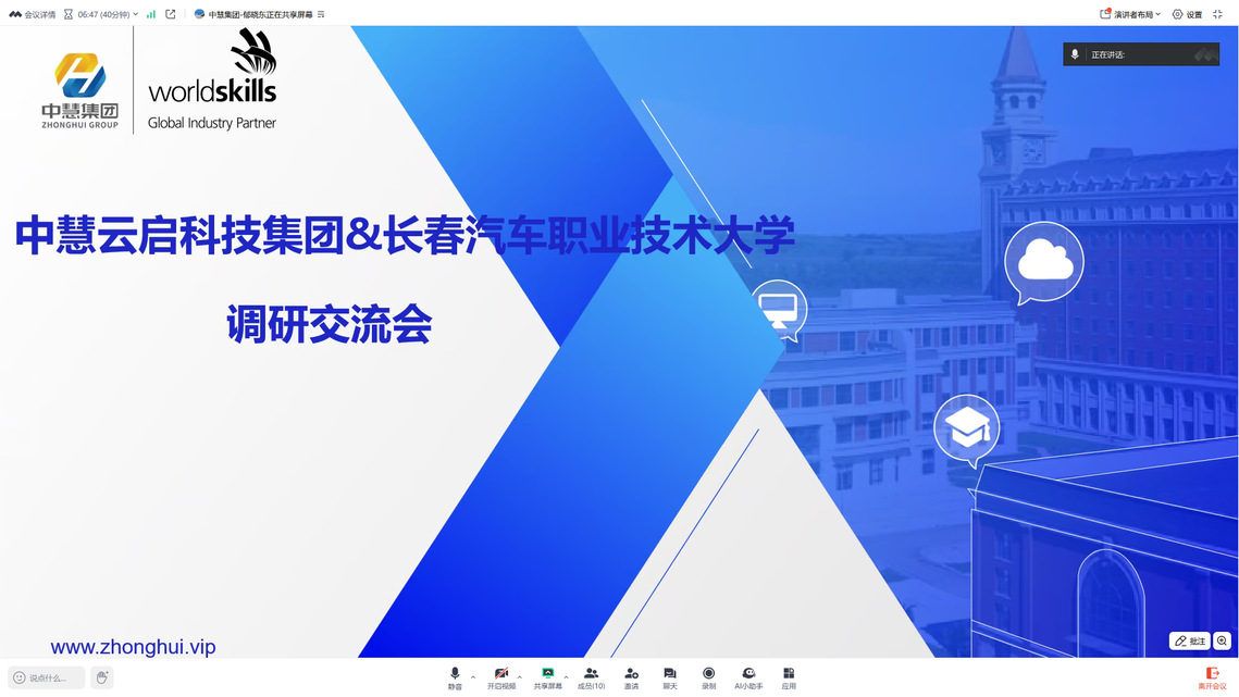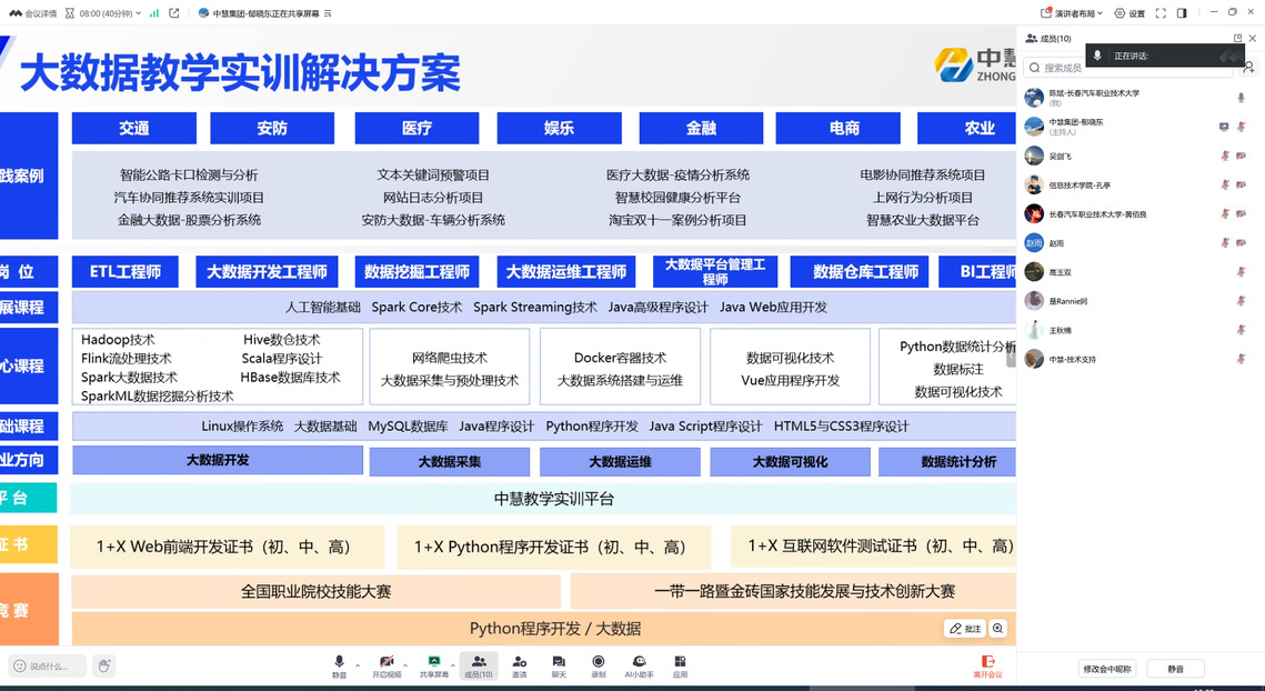 中慧云启代表郁晓东经理详细介绍了企业在大数据实训资源开发、技能竞赛支持等方面的优势成果。作为吉林省职业院校技能大赛Python 赛项的技术支持单位,该集团已形成涵盖课程资源、实训设备、认证考核的完整服务体系,其提出的“实训项目与产业需求同步更新”理念获得在场教师的广泛认同。陈斌主任表示,教研室将以此次合作为契机,推动教学内容从理论导向向实践导向转型,重点强化学生在数据采集、建模分析、可视化应用等核心技能的培养。
