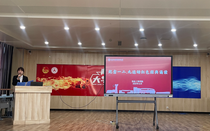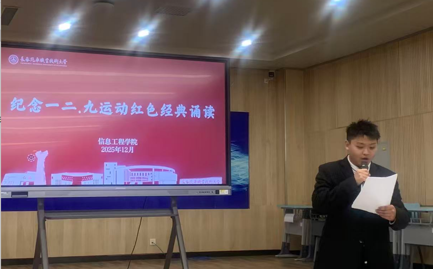 为缅怀革命先烈,传承红色基因,激励青年学子铭记历史、奋发有为,2025年12月9日下午,信息工程学院在学院内成功举办了纪念“一二·九”运动九十周年红色经典诵读活动。学院团总支书记戚旭娣、辅导员徐源、郭延慧出席活动,与现场学生代表共同重温那段激昂澎湃的青春岁月。